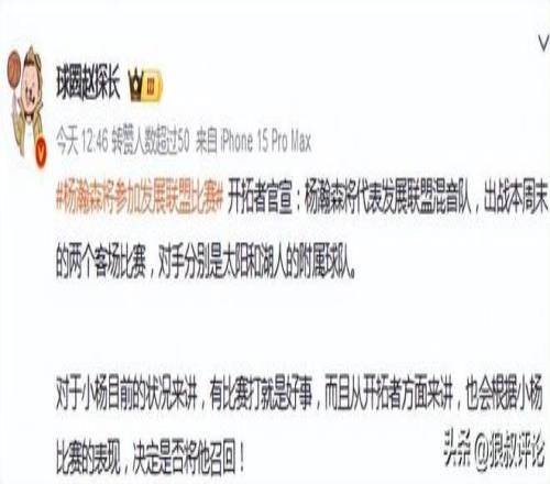 媒体人“海jun的蓝”更新社媒发文点评:“小杨终于有比赛打了,波特兰开拓者官方宣布,瀚森将会在北京时间本周六对阵山谷太阳队和下周一对阵南湾湖人队的比赛中出场。