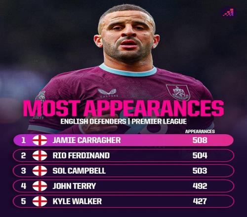英格兰后卫英超出场榜:卡拉格508场居首,沃克427场第五