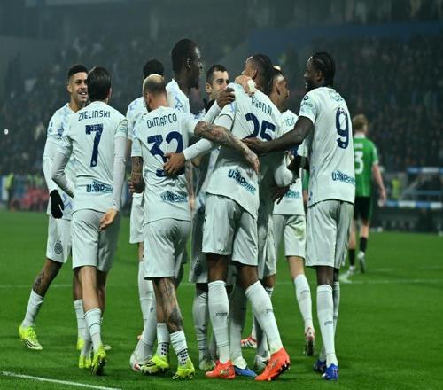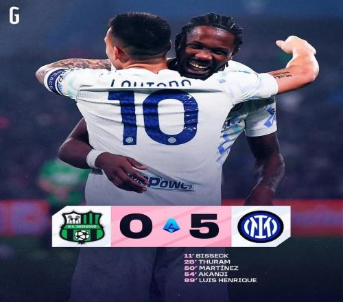今天凌晨,国米在意甲第24轮客场挑战萨索洛。上半场,比塞克头球首开纪录,小图拉姆扩大比分,国米2:0领先。下半场,劳塔罗和阿坎吉3分钟内头顶脚踢将比分扩大到4:0,恩里克在终场前抽射破门,最终国米客场取得5:0大胜!